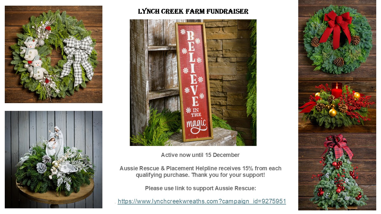 Lynch Creek Farm has some amazing wreaths, center pieces and other greenery decorations for the holidays. The fundraising committee would like to share this great fundraiser with you again this year. Aussie Rescue & Placement Helpline is able to receive 15% back from each qualifying purchase. It really is that easy! You can support our efforts via our online storefront at https://www.lynchcreekwreaths.com?campaign_id=9275951